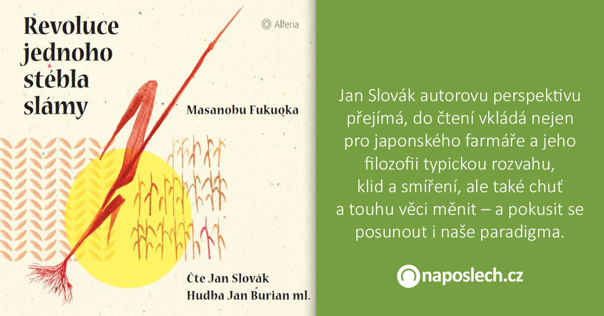 Jestliže zde padlo, že právě text Revoluce jednoho stébla slámy představuje nesnadný úkol pro jakéhokoliv, i zkušeného interpreta a režiséra, v těsném závěsu s tímto tvrzením je nutné dodat, že Alferia i Jan Slovák z toho vyšli velmi dobře. Možná bychom mohli šetřit slůvkem vítězně, neboť přeci jen – byť to bude podstatně záležet na citlivosti každého z posluchačů – v nahrávce existují místa, kdy Slovák svým osobním zaujetím může působit až příliš zapáleně. Nevnímejme to jako kritiku, svým způsobem jde o přirozenou věc – vždyť Fukuoka zprostředkovává ze své pozice a skrze své zkušenosti určitý světonázor. Jan Slovák autorovu perspektivu přejímá, do čtení vkládá nejen pro japonského farmáře a jeho filozofii typickou rozvahu, klid a smíření, ale také chuť a touhu věci měnit – a pokusit se posunout i naše paradigma. Autor této recenze však přiznává, že chvílemi zápasil s přijetím, chvílemi se zkrátka cítil být až příliš tím, kdo se nachází v nekomfortní zóně, prostoru, který není zrovna v souladu s postojem vypravěče.