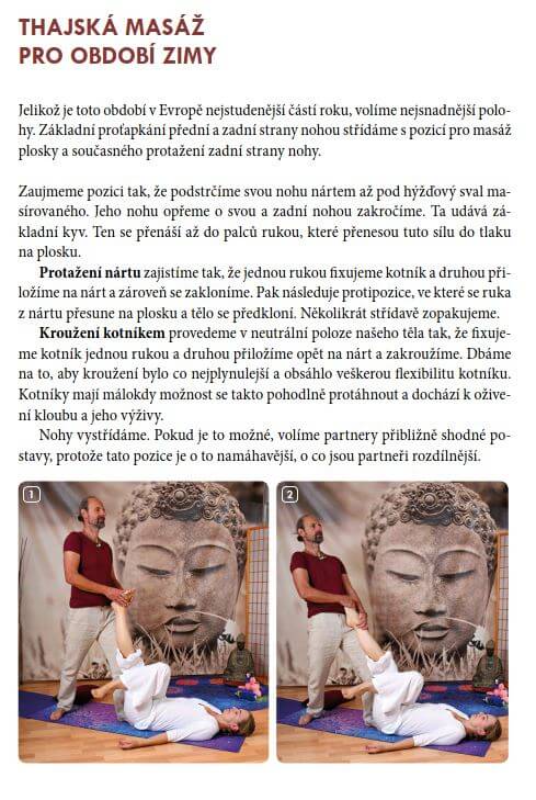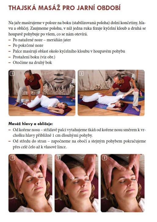 Dechová cvičení příp. některé techniky z thajské masáže – pomocí dechových cvičení získáváme novou energii, obnovujeme vitalitu a harmonizujeme dech v obou nosních dírkách. Thajská masáž podporuje proudění energie v celém těle a vede k vystředění páteře.