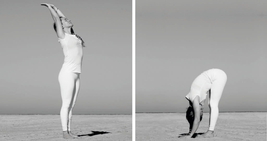 Z této pozice se pomalu předkloňte dolů (paže se stále dotýkají uší), aby se ruce dotkly podlahy. Uvolni mulband.
