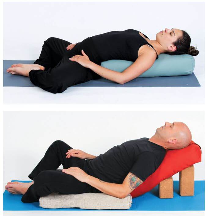 Bolstery jsou vlastně vycpané polštáře a jsou hlavní pomůckou restorativní jógy. Podpírají vás v jednotlivých pozicích. Je-li to možné, pořiďte si plochý a válcovitý tvar. Kulatou podpěru si však můžete vytvořit také srolováním deky. Přibližné rozměry plochého bolsteru jsou 20 x 68 x 82 cm, kulaté pak 22 x 66 x 88 cm. Pokud budete místo nich používat deky, pak je důležité tyto rozměry dodržet. V pozicích a sestavách lze volně používat plochý i válcovitý polštář a záleží na vás, který vám lépe vyhovuje.