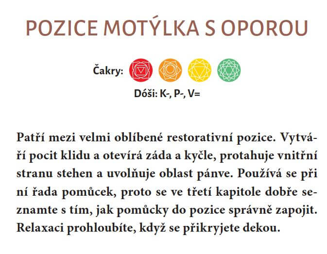 Restorativní jóga je hluboce uvolňující styl jógové praxe. Jedná se o pasivní, nikoliv aktivní praxi. Na rozdíl od aktivnějších stylů, kde pozice „plynou“ jedna za druhou, v restorativní józe se pozice drží pět a dokonce až dvacet minut. Po tuto dobu pomocí dek, bloků a polštářů různých tvarů (bolsterů) a velikostí držíte „formu“. Forma napodobuje podobu některých aktivnějších pozic z aštánga, vinjása nebo Iyengar jógy, například záklony, předklony, rotace či obrácené pozice. Udržet formu vám pomáhají nejrůznější podpůrné pomůcky, díky čemuž dosáhnete kýžených účinků – dojde například k otevření plic, uvolnění napětí v oblasti bederní páteře či jiným přínosům, kterými se budeme zabývat ve druhé kapitole. Pomůcky také vytvářejí dostatečné pohodlí, abyste se mohli pozici plně „odevzdat“.