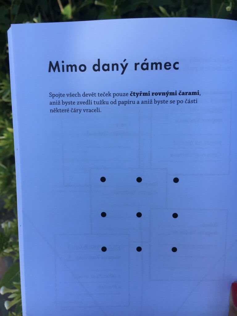 Na fotkách můžete vidět styl knížky. Není pro skeptiky, není pro hledače teorií. Je pro lidi hledající cesty ke spokojenějšímu a vědomému životu ve větší radosti a lehkosti. Je názorná a i pro mě měla pár AHA momentů. Třeba tuto aktivitu „Mimo daný rámec“. Zkuste ji vyluštit! Řešení ale neprozradím…